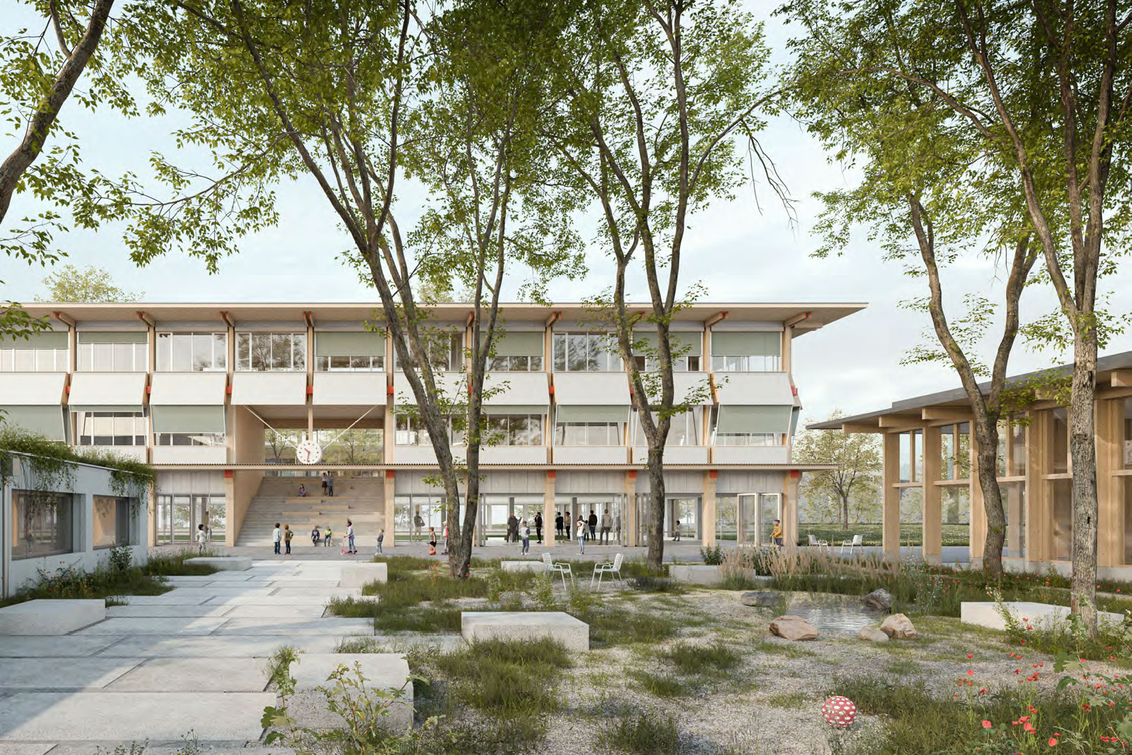 Das Projekt umfasst zwei Neubauten: eine Dreifachturnhalle mit Schulräumen sowie eine Schwimmhalle, die bei Bedarf erweitert werden kann. Diese Gebäude schaffen gemeinsam mit den bestehenden Bauten einen neuen zentralen Schulhof. Die Turnhalle besticht durch lichtdurchflutete Architektur, ein grosszügiges Foyer mit Tribüne und flexible Raumnutzung. Der Schwimmbereich ist als eingeschossiger Pavillon geplant, der um bis zu drei Stockwerke für Schulräume erweitert werden kann.