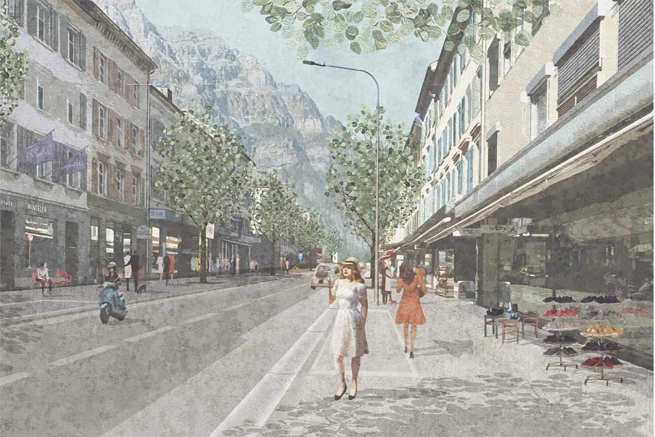 Das Team um Westpol Landschaftsarchitektur und Transitec Beratende Ingenieure gewinnt den Studienauftrag für die Aufwertung des öffentlichen Raums in der Innenstadt von Glarus. Das Team liest die Hauptstrasse als drei unterschiedliche Abschnitte, die gestalterisch differenziert werden. Die Interventionen beziehen sich auf drei Ebenen: Raumoptimierung, Bodenebene und Baumebene. Die Fahrbahnbreite wird zugunsten der Vorzonen optimiert, so dass Platz für Bäume und die Nutzung durch die Erdgeschosse frei wird.