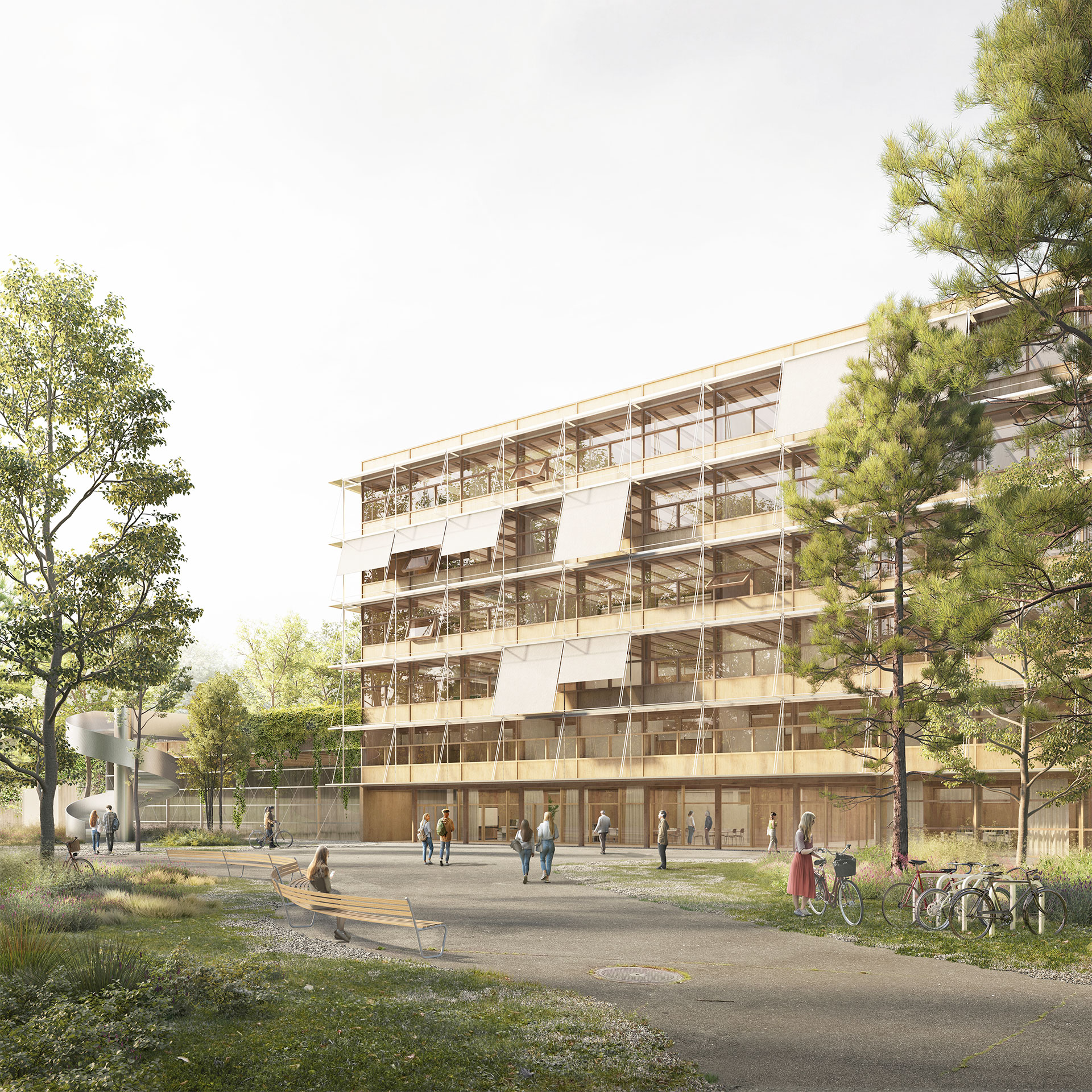 Mit der ausgewogenen Balance zwischen gezielten ortspezifischen Massnahmen im Sockelbereich und der in hohem Mass prototypisch ausformulierten, seriellen Raum- und Gebäudestruktur der Unterrichtsgeschosse erfüllt das Projekt «Niagara» die anspruchsvollen Anforderungen der «Schulbauten der Zukunft» sowohl in schulischer als auch in baulicher Hinsicht überwiegend elegant und souverän. Gleichzeitig gelingt es den Verfassenden, mit dem auf jedem Geschoss unterschiedlich erlebbaren Atrium als verbindende Mitte und der unaufgeregten Einbettung des schlichten, jedoch prägnanten Baukörpers in seine direkte Nachbarschaft überzeugende Bilder für die zukünftige Lehr- und Lernlandschaft zu zeichnen, die in einer nachhaltigen Grundhaltung verwurzelt sind. (Text aus dem Jurybericht)