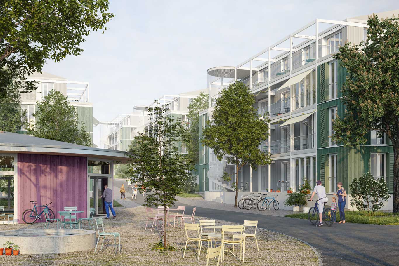 Die städtebaulichen und aussenräumlichen Qualitäten der bisherigen Siedlung sollen auch in der neuen Überbauung «Am Rain» erhalten werden. Fünf von sechs Häuser werden erhalten, transformiert und erweitert. Geschickt wird die heute engste Stelle mit dem Abbruch des sechsten Hauses an der südöstlichen Parzellenecke behoben: Am Übergang von der Dorfstrasse zur Begegnungszone «Am Rain» entsteht ein einladender Siedlungsplatz mit einem Pavillon für die gemeinschaftlichen Aktivitäten der Genossenschafter:innen. Auch die Einstellhalle kann hier innerhalb des Projektperimeters realisiert werden. (Text: Jurybericht und Redaktion espazium.ch)