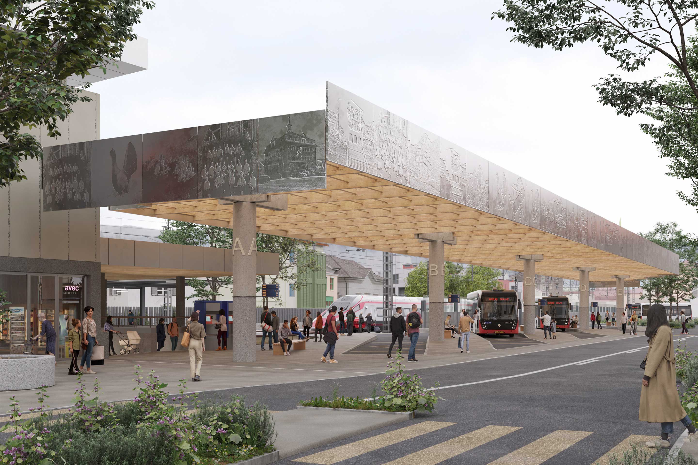 Bushofdach, Bahnhofsgebäude und Veloturm werden zu einer einzigen architektonischen Geste zusammengeführt und machen das gesamte Ensemble zu einem integralen Bestandteil des Bahnhofplatzes. (Text: Jurybericht und Redaktion espazium.ch)