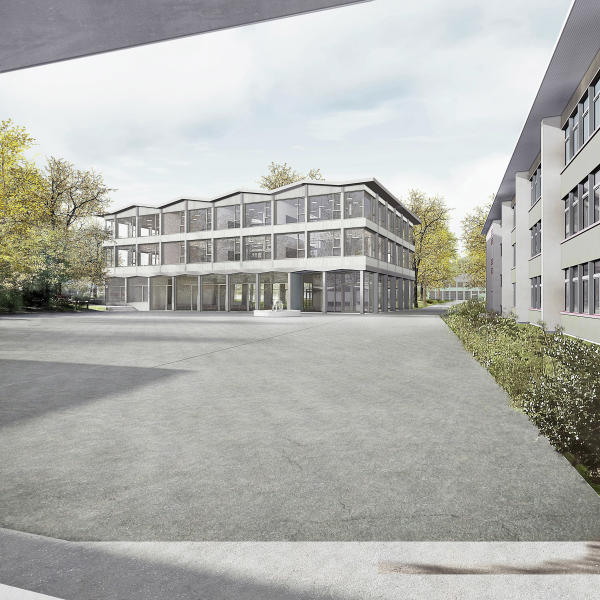 Der Beitrag «Enkelin» von Lukas Back gewinnt den Wettbewerb mit einem gut platzierten Neubau, der zwei Aussenräume mit unterschiedlichem Charakter definiert. Der befestigte Pausenplatz im Norden bleibt weitgehend bestehen, während im Süden ein neuer Garten entsteht. Das mit Glas ausgefachte Betongerippe des neuen Gebäudes nimmt Bezug auf die Architektur der 1950er-Jahre und passt sich wie ein Chamäleon in die Gesamtanlage ein.