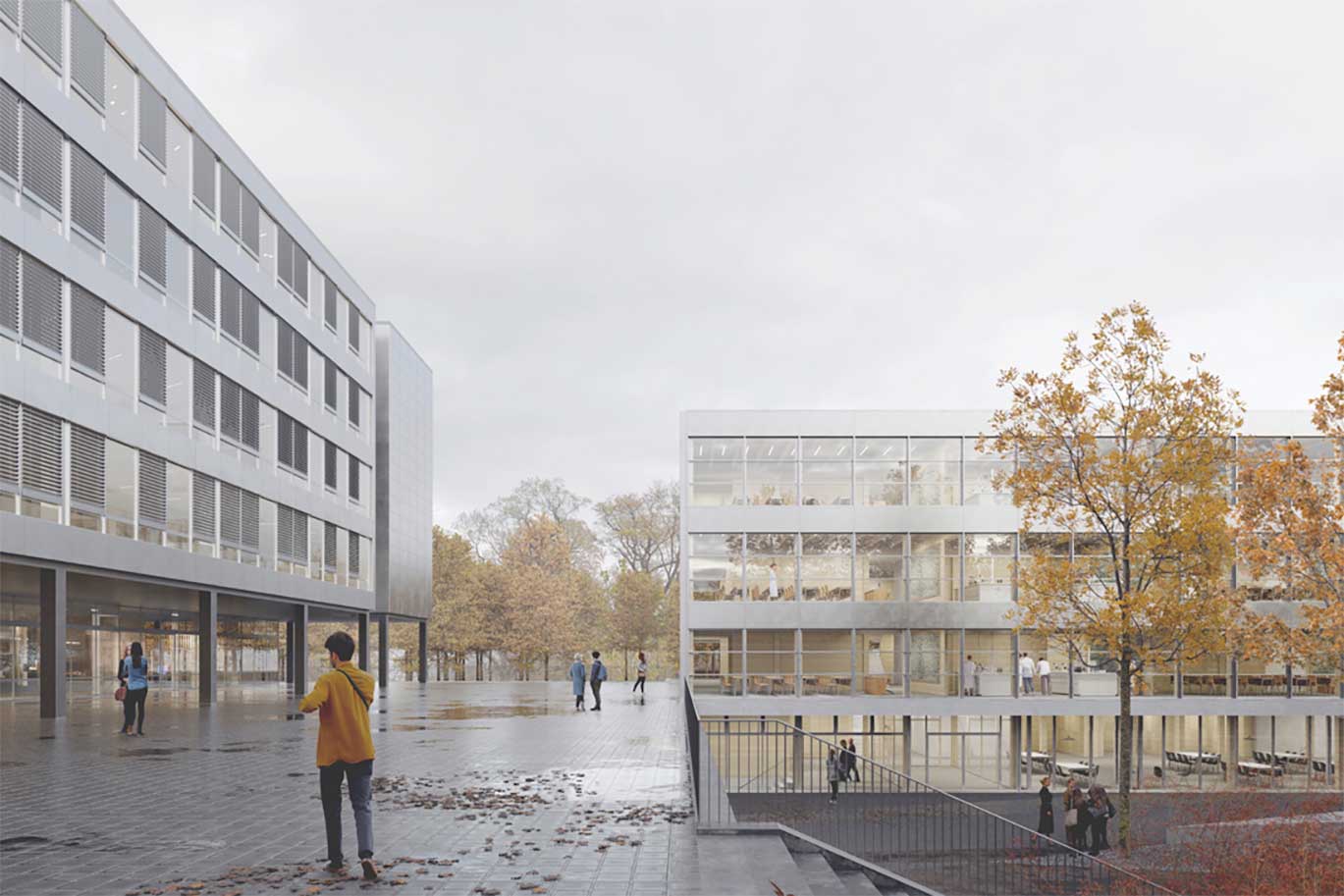 Das Gymnasium Neufeld erhält einen Ersatzneubau. Das Projekt «Gravitationsfeld» des Architekturbüros Studio Nosu KLG aus Zürich überzeugt mit dem neuen, kompakten Nordtrakt und grosszügigen Aussenräumen.