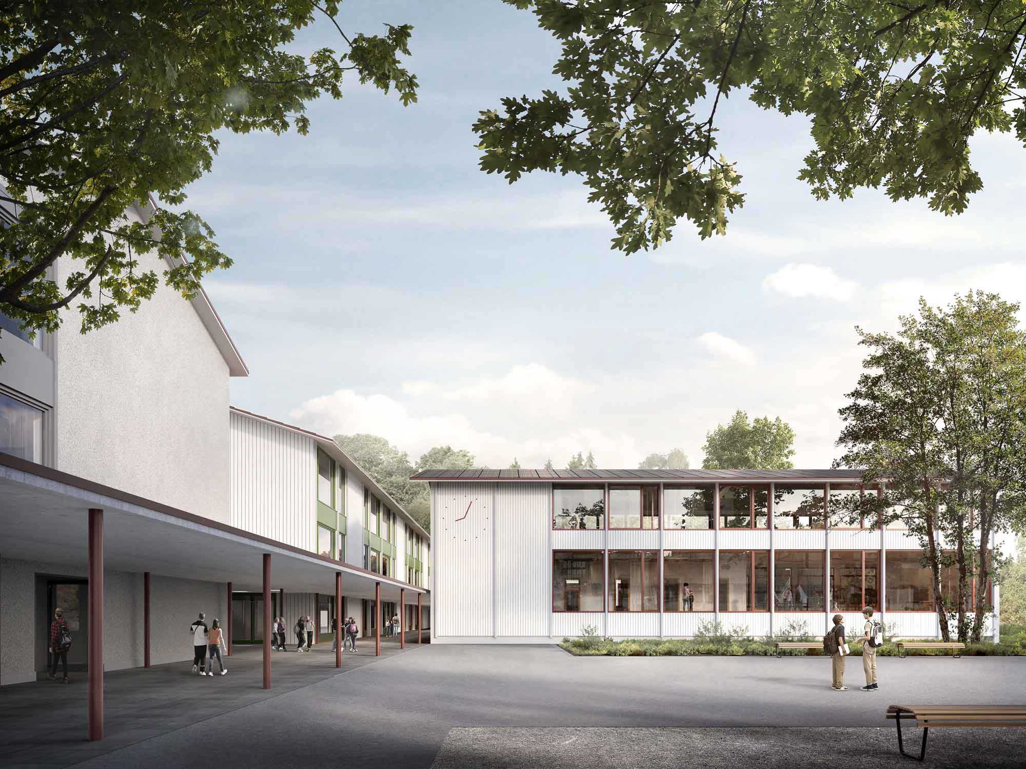 Gewinner des Wettbewerbs ist das Projekt «huckepack» der Haller Gut Architekten ETH SIA und Weber + Brönnimann Landschaftsarchitekten. Es wird zur Weiterbearbeitung empfohlen. Respekt und Sensibilität lässt sich aus dem Projekt ablesen. Eine Haltung, die sich über den ganzen Entwurf zieht. Der Ökologie wird hoher Stellenwert eingeräumt. Eingriffe werden nur dort vorgenommen, wo es nötig ist. Trotzdem kann die Schulanlage auf die neuen Bedürfnisse angepasst werden. Das liest sich denn auch im Projekt und in der Umgebungsgestaltung. Es entsteht eine Architektur, die elegant und selbstverständlich wirkt. Insgesamt verspricht der Projektvorschlag eine gute Wirtschaftlichkeit bei Erstellung und Betrieb. Durch das konsequente Weiterbauen und das Ergänzen der bestehenden Bauten wird das Projekt auch beim Verbrauch von Grauer Energie punkten. (Text: Jurybericht und Redaktion espazium.ch)