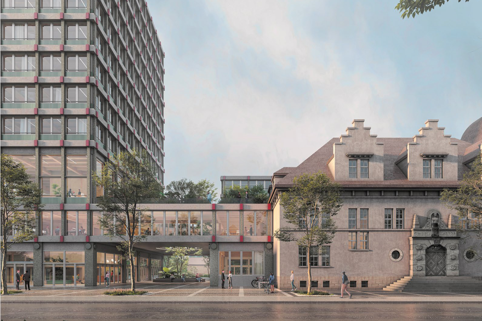 Das Siegerprojekt «Syntagma» überzeugte die Jury mit einem harmonischen Ensemble aus drei Neubauten und dem denkmalgeschützten Bestand. Es fügt sich sensibel in die Umgebung ein und setzt gleichzeitig einen markanten städtebaulichen Akzent.