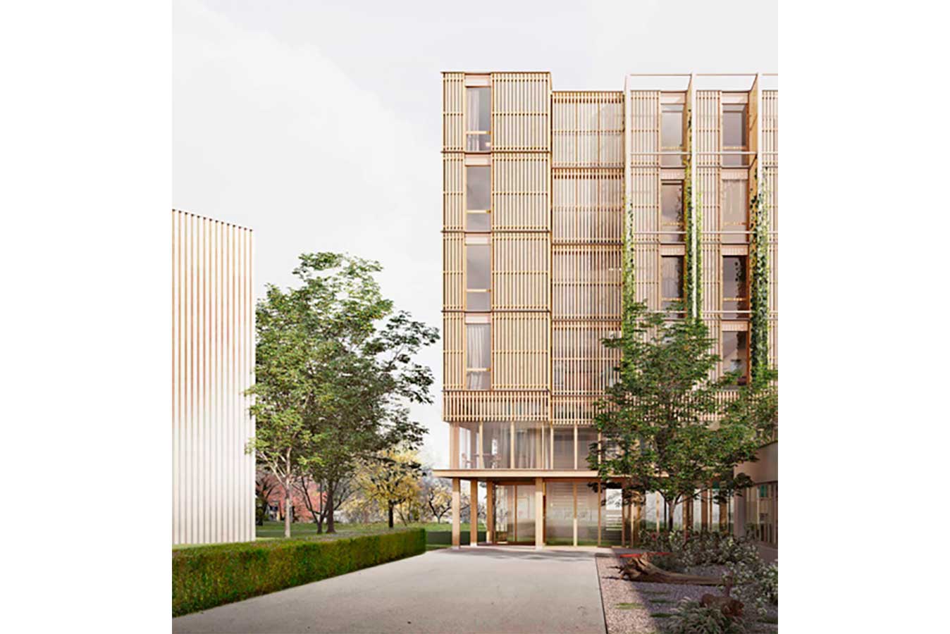 Das Siegerprojekt überzeugt durch seine sehr sorgfältige architektonische und landschaftliche Ausarbeitung sowie seine städtebauliche Einordnung. Der sechsgeschossige Neubau wird zwischen dem Schulpavillon und der Sporthalle platziert. Mit der Holzverkleidung und den berankten Pergolen lehnt sich das Gebäude an die Baukunst der Gartenstädte des frühen 20. Jahrhunderts an und fügt sich damit gekonnt in die geschützte Umgebung ein. Die Räume für die vier Wohn- und zwei Mittagsgruppen sind offen und hell gestaltet, wodurch für Gebärdensprechende für die Verständigung wichtige Sichtbeziehungen geschaffen werden. Der Neubau ist als Holzbau konzipiert und wird mit einer Wärmepumpe beheizt werden sowie über Solarmodule verfügen. Die vorgegebenen Raumhöhen ermöglichen eine spätere flexible Umnutzung in Schulräumlichkeiten. Zudem ist vorgesehen, den Bau im Sinne der Kreislaufwirtschaft rückbau- und recyclingfähig zu planen. (Text aus der Medienmitteilung)