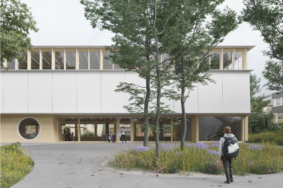 Geplant ist ein dreigeschossiger Neubau, «der sowohl der Schule als auch dem Dorf neue Möglichkeiten eröffnet – für Sportveranstaltungen, Konzerte und als Treffpunkt... Die kompakte Bauweise, die leichte Holzkonstruktion und der haushälterische Umgang mit den vorhandenen Landreserven gewährleisten eine sparsame Nutzung der Ressourcen.» (Text: Jurybericht und Redaktion espazium.ch)