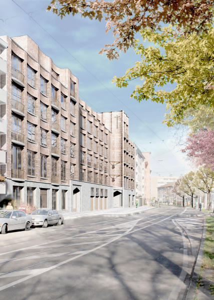 Das Preisgericht empfiehlt einstimmig den Beitrag von Lorenz Architekten zur Weiterbearbeitung. Der neue «Stadtbaustein» schliesst die Blockrandbebauung mit einer überzeugenden Staffelung der Strassenfassade in drei Teile. Das schafft einen grosszügigen Vorplatz für die öffentliche Nutzung und ermöglicht es, eine Ecke des gestaffelten Baukörpers als Glockenturm auszubilden. Als Referenz dient die Antoniuskirche von Karl Moser, die sich ebenfalls in einen Blockrand einfügt und dennoch als öffentliches Gebäude aus der Flucht herausragt.