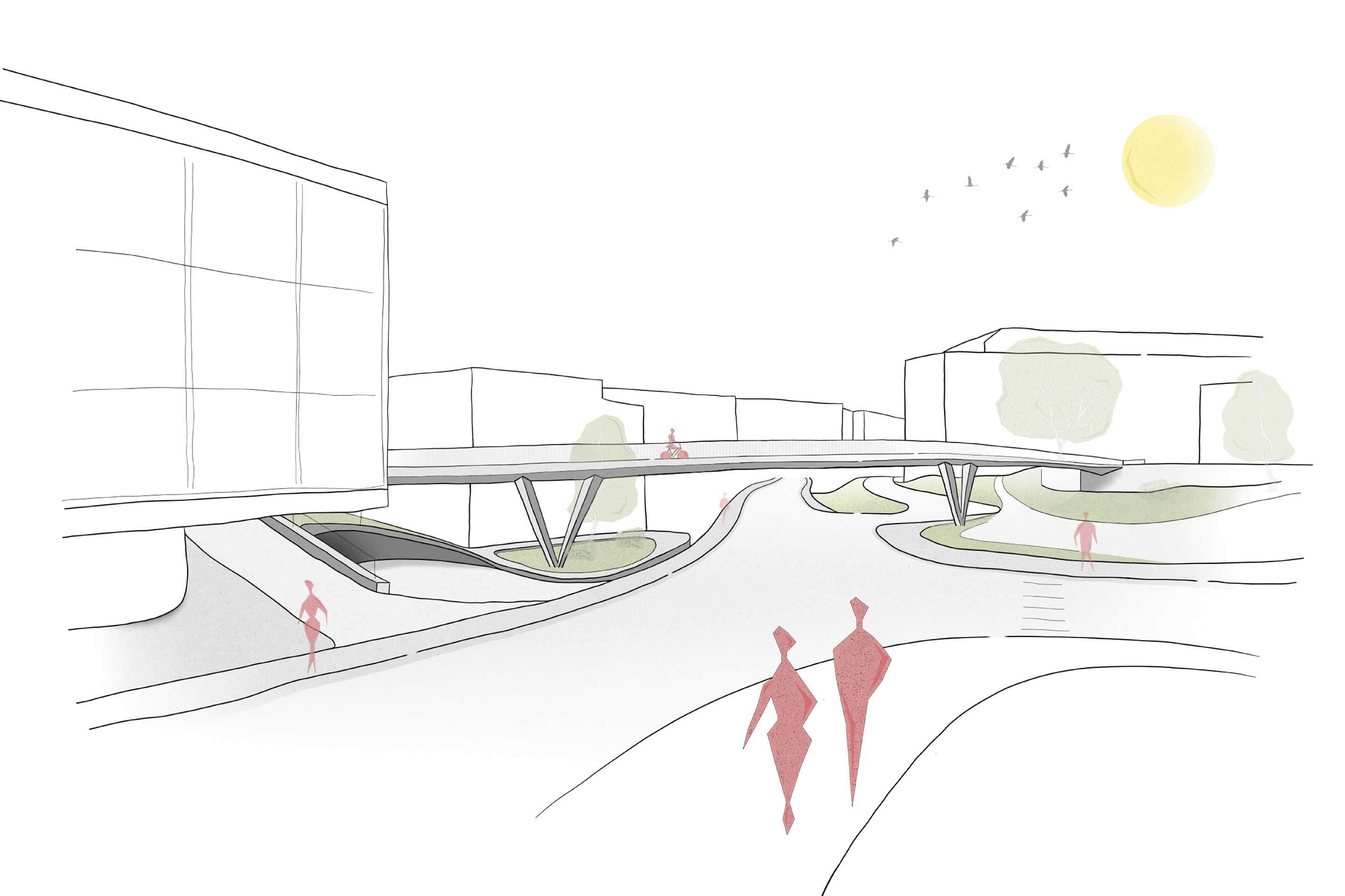 Das Projekt führt ausgehend vom Areal des Kantonsspitals zwischen Haus Nr. 02 und Haus Nr. 03 als Brücke in einem sanften Linksbogen gefolgt von einer grosszügigen Rechtskurve zum Widerlager zwischen Athletikzentrum und Feuerwehr. Im Bereich des Vorplatzes der Feuerwehr führt der Weg in einer Linkskurve um die Nordostecke des Athletikzentrums und dann in einem leicht geschwungenen Verlauf entlang deren Nordfassade. Um den Bereich der Nordostecke des Athletikzentrums bei der Feuerwehr übersichtlich zu gestalten, werden die Fahrspuren der Ein- und Ausfahrt der Tiefgaragen im Athletikzentrum mit der Feuerwehrrampe lagemässig getauscht und entsprechend umgebaut. (Text: Medienmitteilung)