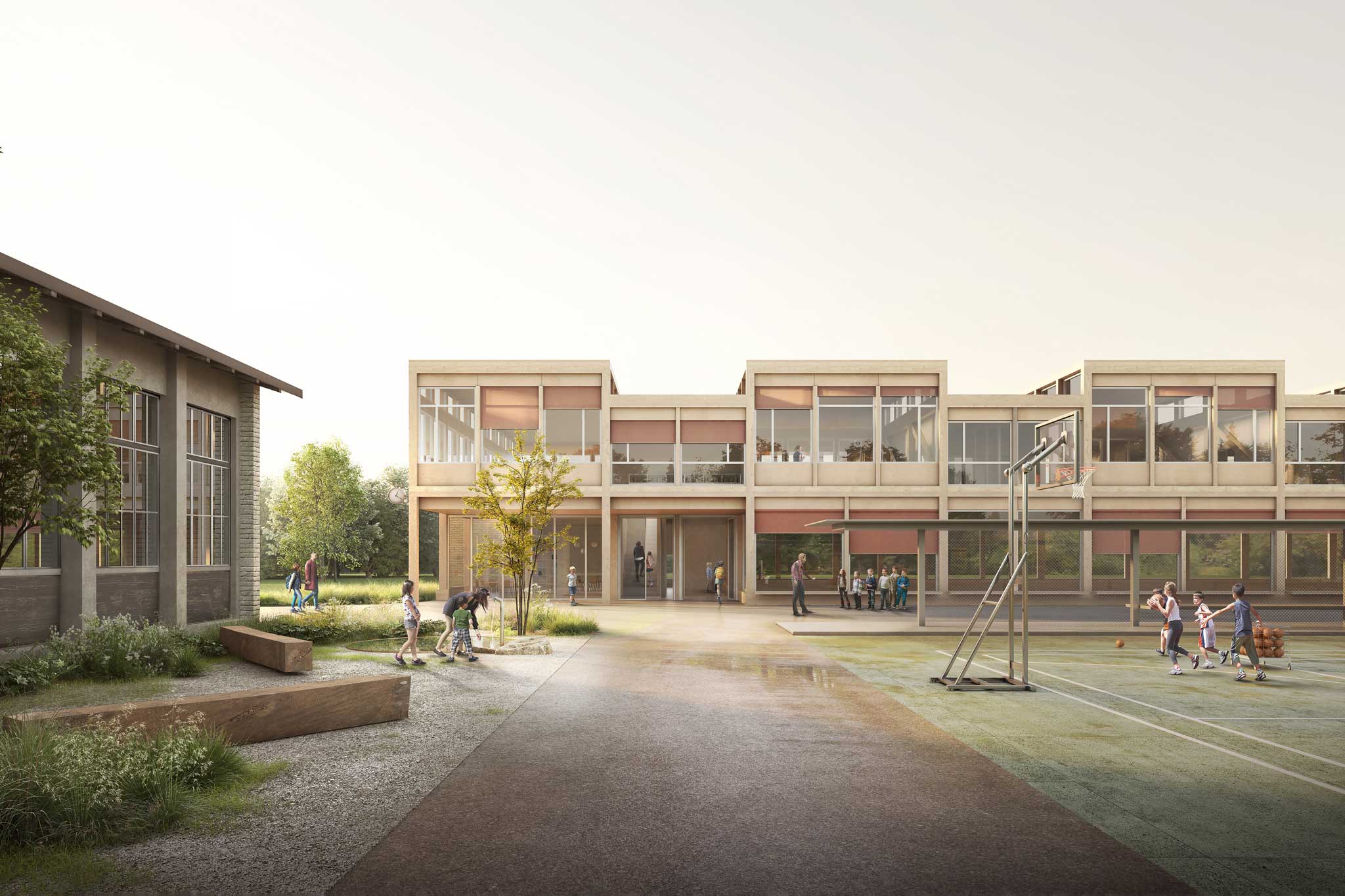 Das Projekt sieht vor, den schützenswerten und identitätsstiftenden Hauptbau mit Mittelbau und Turnhalle sorgfältig zu sanieren. In diesem Gebäudekomplex sind künftig die Tagesschule, die Schulleitung sowie Sonderräume untergebracht. Aus der heutigen Turnhalle entsteht eine Aula. Im Nordosten der Anlage ist künftig die Basisstufe untergebracht. Das Siegerprojekt sieht vor, den Holzpavillon zu erhalten und mit einem kompakten Holzneubau zu ergänzen. Bei der Weiterbearbeitung des Projekts überprüft die Stadt die Wirtschaftlichkeit des Erhalts des Holzpavillons. Das Containerprovisorium im Südwesten des Areals und der Modulbau, der heute die Tagesschule beheimatet, weichen dem zweiten, grösseren Neubau aus Holz und Beton. Er ist diagonal zum bestehenden Hauptgebäude angeordnet und enthält die neue Doppelturnhalle Typ B. Darüber sind Klassen- und Gruppenräume für die oberen Jahrgangsstufen sowie Multifunktionszonen und Spezialräume angeordnet.