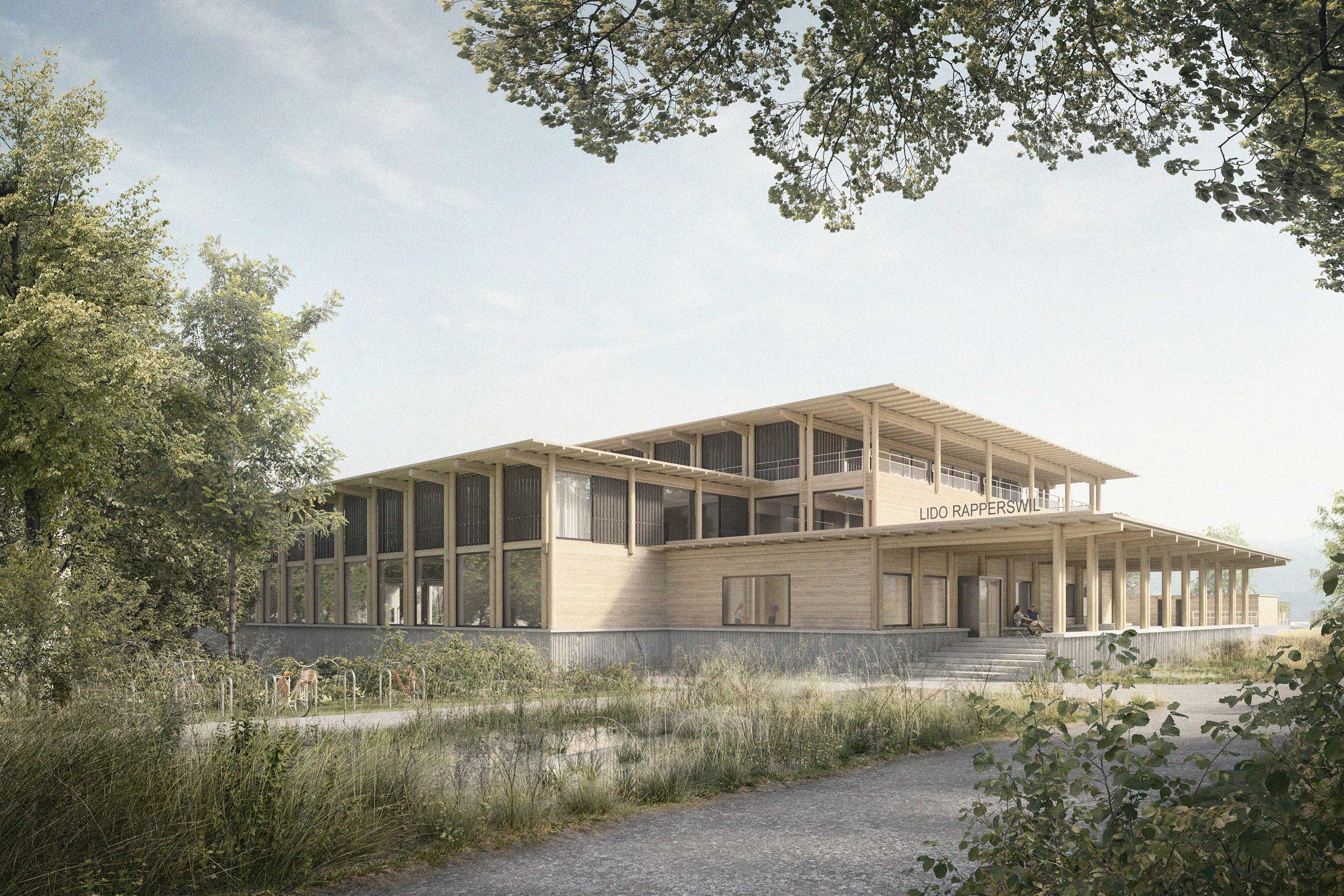 Gewonnen hat das Team von Peter Moor und raderschallpartner mit dem Projekt «Dreiteiler». Der Name ist Programm: Das Schwimmbad besteht aus drei harmonisch gefügten Volumen, die geschickt in die Umgebung zwischen Wohnbauten und Eishalle gesetzt wurden. Die Dreiteilung des Baukörpers gibt unmittelbar Aufschluss über seine innere Organisation und die clevere Wegeführung im Gebäude überzeugte die Jury. Die Staffelung bricht einerseits optisch die Gebäudelängen und ermöglicht andererseits die Verzahnung des Hallenbads mit dem Aussenraum. Die «neue Fuge», wie der Freiraum im Jurybericht bezeichnet wird, setzt sich zum See hin als von vielen Bäumen begleiteter Strandweg fort und zeigt damit ein langfristiges Denken in Bezug auf den Masterplan. (Text: Jennifer Bader)