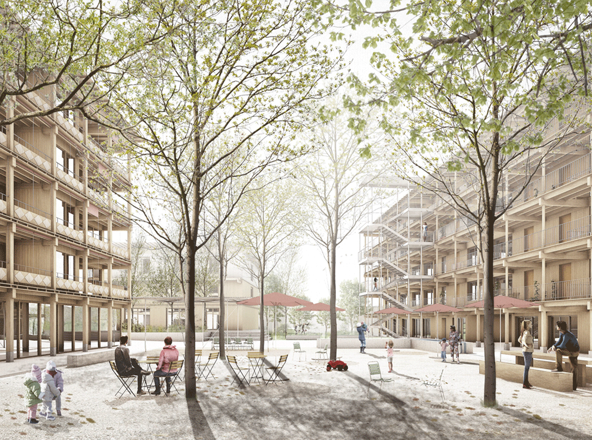Das Ensemble mit den drei unterschiedlichen Neubauten gliedert sich um einen geräumigen, zentralen Hof, der zur Herrenmattstrasse adressiert ist und einen spürbaren Bezug zum Aussenraum der nordwestlich angrenzenden Mehrfamilienhäuser aufbaut. Insgesamt überzeugt der Vorschlag durch seine einfache Grundkonzeption und die bestechende Idee der kraftvollen Mitte.