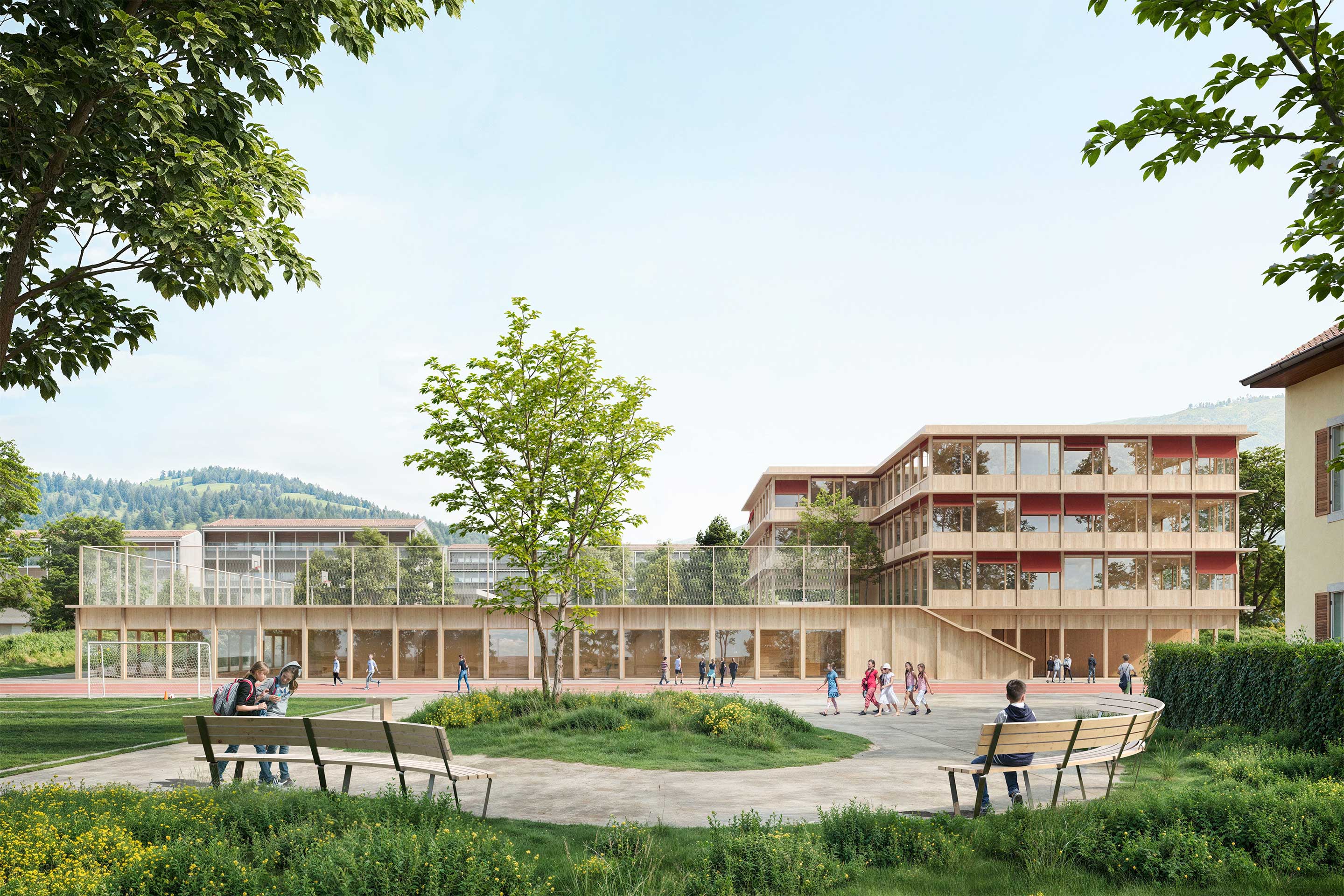 Situé au cœur du village, le site existant peinait à suivre l’évolution démographique et les nouvelles exigences pédagogiques. Le projet lauréat relève ce défi avec une grande clarté d’intervention, concentrant les ajouts sur des points clés, sans diluer l’identité du lieu. Le cœur de la proposition réside dans un nouveau bâtiment scolaire et sportif, implanté au sud du site. Ce volume rassemble la majorité du programme – salles de classe, salle de sport, espaces spécialisés – tout en laissant à part la crèche et le réfectoire. Il redéfinit harmonieusement les espaces publics alentour, notamment la place du Châtelard et la rue du Collège, désormais pensée comme espace de rencontre. Les typologies de classes misent sur une double orientation, des circulations généreuses et lumineuses, et des usages appropriables. L’intégration paysagère soigne les transitions entre bâtiments et espaces extérieurs, en créant une diversité d’ambiances adaptée à chaque tranche d’âge. Certains points restent à optimiser – circulation verticale, densité des distributions, volumétrie de la crèche – mais l’approche pragmatique, contextuelle et évolutive est convaincante. Ce projet offre aux enfants de Corsier-sur-Vevey non seulement de nouvelles classes, mais une vision cohérente d’un lieu d’apprentissage tourné vers l’avenir.